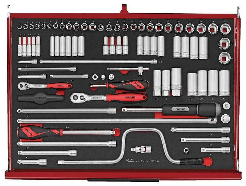 TengTools 26" PRO35™ verktøysett TKW26R278F er designet for å møte behovene til profesjonelle industribrukere. Dette praktiske og kompakte verktøysettet består av 278 deler som er plassert i et slitesterkt rullekabinett i matt rød. Det måler 680 mm i bredde, 460 mm i dybde og 960 mm i høyde med hjulene montert. Rullekabinettet har en 3-delt ramme av kraftig stål, og hele oppbevaringsenheten har gjennomgått en fosfatfri 5-trinns rustbeskyttelsesprosess for å sikre lang levetid og korrosjonsbestandighet. Rullekabinettet har syv fullt uttrekkbare skuffer – fem med en høyde på 75 mm og to dypere skuffer på 154 mm, hver med en lastekapasitet på opptil 40 kg for å romme et utvalg av verktøy i forskjellige størrelser. Alle skuffer er utstyrt med lettgående kulelagrede skinner og lydabsorberende EVA-matter som beskytter verktøyene. Verktøysettet tilbyr et omfattende utvalg av verktøy for industrielle applikasjoner, inkludert 72-tenners skralle, piper, kombinasjonsnøkler, diverse skrutrekkere, en skrallende bitsholder med tilhørende bits, og 14 vinylbelagte tenger designet for god tilgang i trange rom. Rullekabinettet leveres med verktøy i 5 av de tilgjengelige 7 skuffene, noe som gir rom for utvidelse og tilpasning etter brukerens behov. Verktøyene er organisert i presisjonskuttede moduler laget av høy tetthet, tre-farget EVA-skum som hjelper med å raskt identifisere manglende verktøy, noe som øker effektiviteten og sikkerheten. Rullekabinettet har hull på begge sider for å feste ekstra tilbehør. Det er utstyrt med to 5" bremsede svingbare hjul og to 5" faste hjul, samt et komfortabelt håndtak for enkel manøvrering. Et tresifret kombinasjonslås holder verktøyene sikre. Settet inkluderer også en TCA08 papirholder.