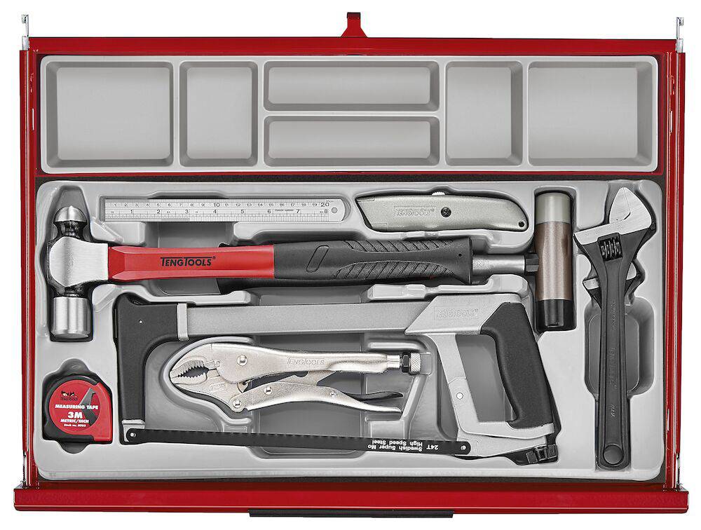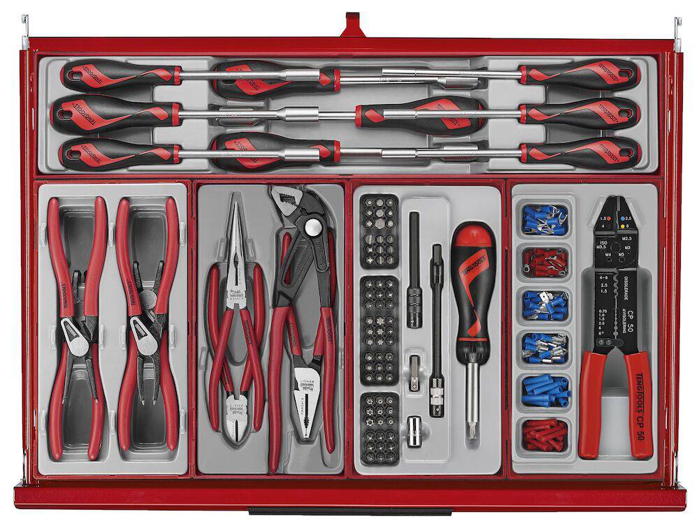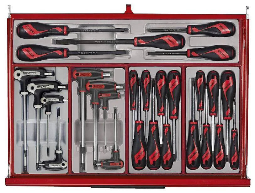TengTools 26" PRO35™ verktøysett TKW26R278F er designet for å møte behovene til profesjonelle industribrukere. Dette praktiske og kompakte verktøysettet består av 278 deler som er plassert i et slitesterkt rullekabinett i matt rød. Det måler 680 mm i bredde, 460 mm i dybde og 960 mm i høyde med hjulene montert. Rullekabinettet har en 3-delt ramme av kraftig stål, og hele oppbevaringsenheten har gjennomgått en fosfatfri 5-trinns rustbeskyttelsesprosess for å sikre lang levetid og korrosjonsbestandighet. Rullekabinettet har syv fullt uttrekkbare skuffer – fem med en høyde på 75 mm og to dypere skuffer på 154 mm, hver med en lastekapasitet på opptil 40 kg for å romme et utvalg av verktøy i forskjellige størrelser. Alle skuffer er utstyrt med lettgående kulelagrede skinner og lydabsorberende EVA-matter som beskytter verktøyene. Verktøysettet tilbyr et omfattende utvalg av verktøy for industrielle applikasjoner, inkludert 72-tenners skralle, piper, kombinasjonsnøkler, diverse skrutrekkere, en skrallende bitsholder med tilhørende bits, og 14 vinylbelagte tenger designet for god tilgang i trange rom. Rullekabinettet leveres med verktøy i 5 av de tilgjengelige 7 skuffene, noe som gir rom for utvidelse og tilpasning etter brukerens behov. Verktøyene er organisert i presisjonskuttede moduler laget av høy tetthet, tre-farget EVA-skum som hjelper med å raskt identifisere manglende verktøy, noe som øker effektiviteten og sikkerheten. Rullekabinettet har hull på begge sider for å feste ekstra tilbehør. Det er utstyrt med to 5" bremsede svingbare hjul og to 5" faste hjul, samt et komfortabelt håndtak for enkel manøvrering. Et tresifret kombinasjonslås holder verktøyene sikre. Settet inkluderer også en TCA08 papirholder.