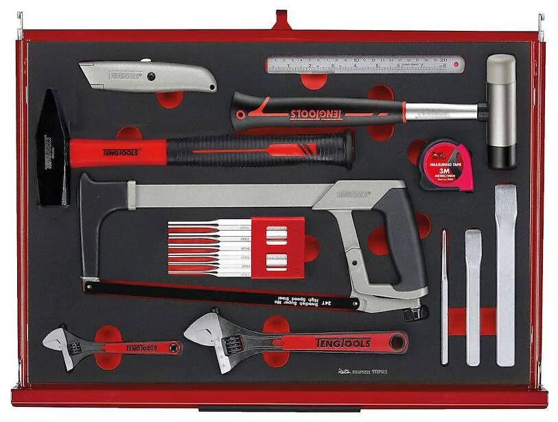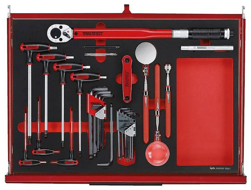 TengTools 26" PRO35™ verktøysett TKW26R335F i matt rød finish har 335 deler plassert i et slitesterkt TSW26R7 rullekabinett, som måler 680 mm i bredde, 460 mm i dybde og 960 mm i høyde med hjulene montert. Det praktiske rullekabinettet har syv fullt uttrekkbare skuffer, fem med en høyde på 75 mm og to høyere skuffer på 154 mm, hver med en lastekapasitet på opptil 40 kg. Hver skuff er utstyrt med kulelagrede skinner og foret med lydabsorberende og beskyttende EVA-matter. Rullekabinettet har et 3-delt kraftig stålkabinett designet for daglig profesjonell bruk. Det er pulverlakkert og har gjennomgått en fosfatfri 5-trinns rustbeskyttelsesprosess for å sikre lang levetid og korrosjonsbestandighet. Verktøysettet inkluderer verktøy for mekanisk arbeid, inkludert diverse pipesett, skralle, filer, tenger, låsetenger, kombinasjonsnøkler, skrutrekkere, bits, T-håndtak sekskant- og tx-nøkler, en momentnøkkel, inspeksjonsverktøy og generelle verktøy. Alle verktøyene er organisert i presisjonskuttede moduler av høy tetthet tre-farget EVA-skum, som gjør det enkelt å oppdage eventuelle verktøy som er ute av plass. Rullekabinettet har hull på begge sider for å feste diverse tilbehør. Det er utstyrt med to 5" bremsede svingbare hjul og to 5" faste hjul, samt et komfortabelt håndtak for enkel manøvrering rundt i verkstedet. Et tresifret kombinasjonslås holder verktøyene sikre.