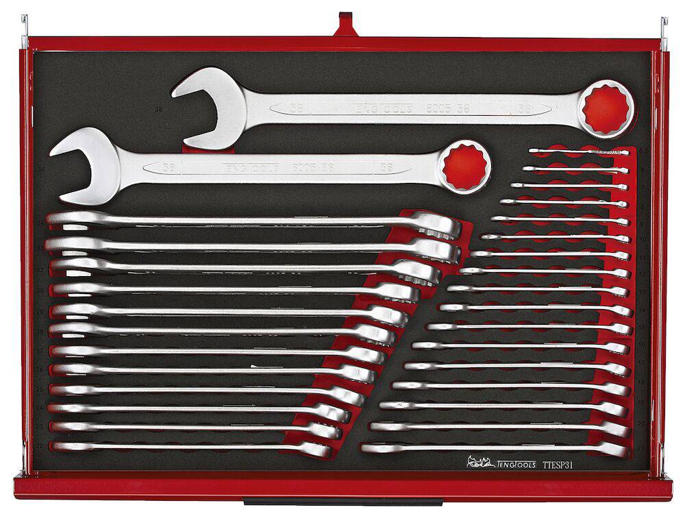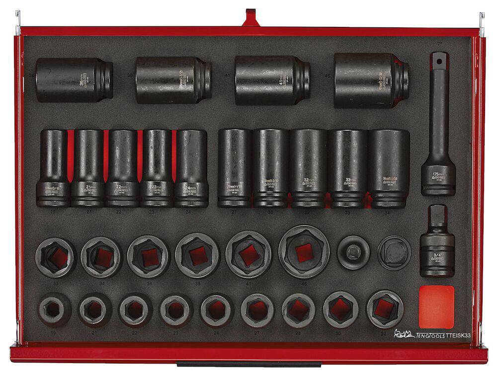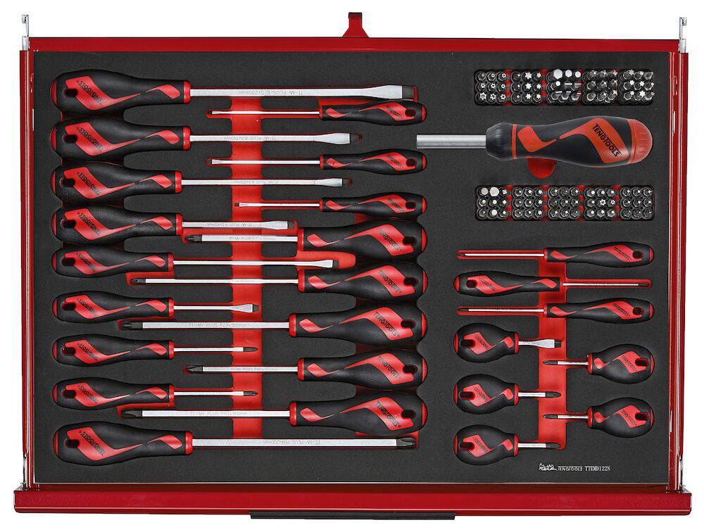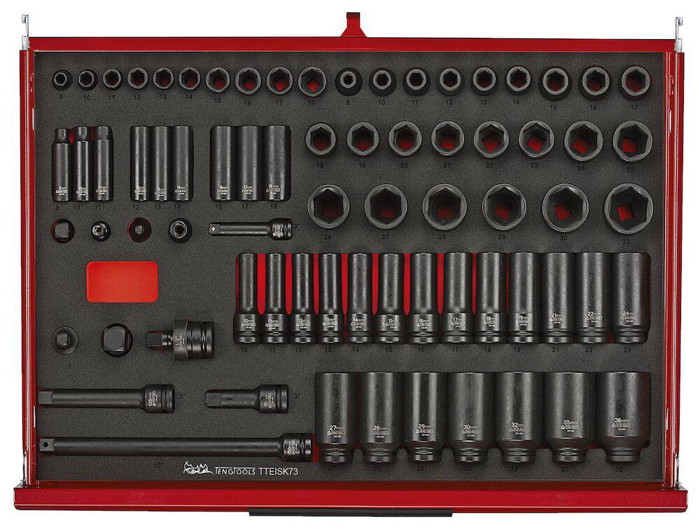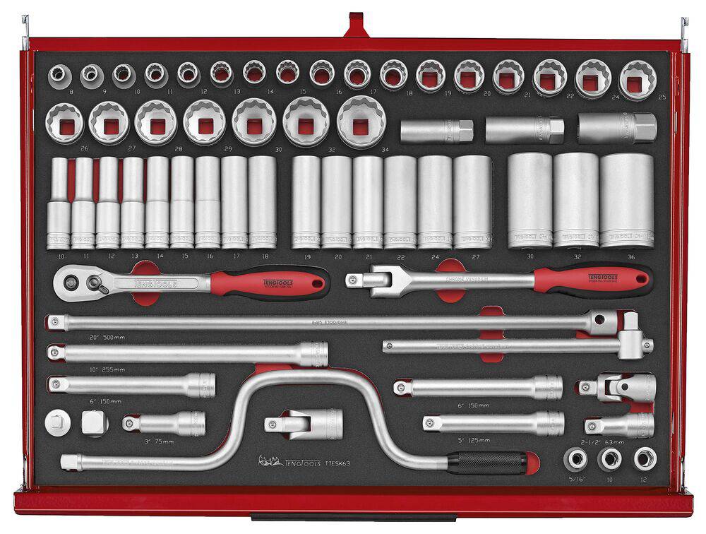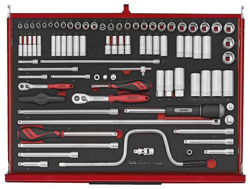 TengTools 26" PRO35™ verktøysett TKS26R528F består av 528 deler og tilbyr et omfattende verktøyutvalg for krevende miljøer som gruvedrift og tungindustri. Dette to-lags stablesystemet inkluderer TSW26R7 verktøyvogn og TST26R5F verktøykasse, som sammen utgjør et oppbevaringssystem med 12 fullt uttrekkbare skuffer. De totale dimensjonene er 680 mm i bredde, 460 mm i dybde og 1430 mm i høyde med hjul, noe som gjør det til et romslig, men håndterbart verktøysett. verktøyvognen består av syv skuffer, med fem som måler 75 mm i høyde og to høyere skuffer på 154 mm, hver med en kapasitet på 40 kg. TST26R5F verktøykasse tilfører fem skuffer – to på 50 mm og tre på 75 mm i høyde, som kan dekkes av en nedfellbar front med TengTools-logoen. Verktøysettet er utstyrt for et bredt spekter av oppgaver, inkludert ulike størrelser av slagpiper, nøkler, skrutrekkere, bits, mutterdrivere, T-håndtak, og tenger. Alle verktøyene er organisert i presisjonskuttede moduler av høy tetthet EVA-skum i tre farger, noe som gjør det enkelt å raskt identifisere manglende verktøy og opprettholde effektivitet og sikkerhet i alle operasjoner. verktøyvognen er designet for enkel manøvrering, med to 5" bremsede svingbare hjul og to 5" faste hjul, samt et komfortabelt gripehåndtak. Både verktøyvognen og verktøykassen er utstyrt med slitesterke aluminiumshåndtak og har skuffer som glir lett på kulelagrede skinner. Sikkerheten økes med et tresifret kombinasjonslås på hver enhet for å beskytte verdifulle verktøy. Den kraftige toppkvalitets stål-konstruksjonen sikrer at disse enhetene tåler kravene til profesjonell bruk i tøffe miljøer. I tillegg har begge enhetene gjennomgått en 5-trinns fosfatfri rustbeskyttelsesprosess og er ferdigbehandlet med en pulverlakk i matt rød