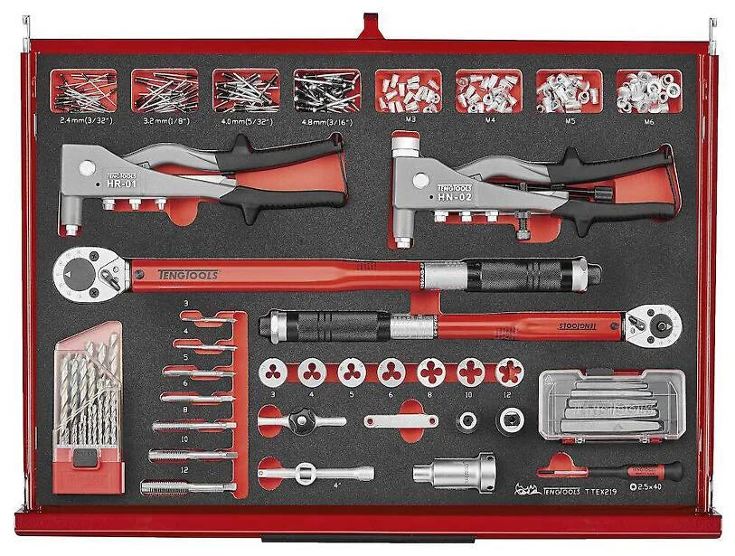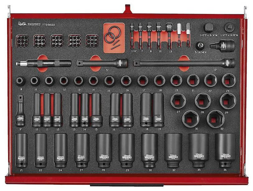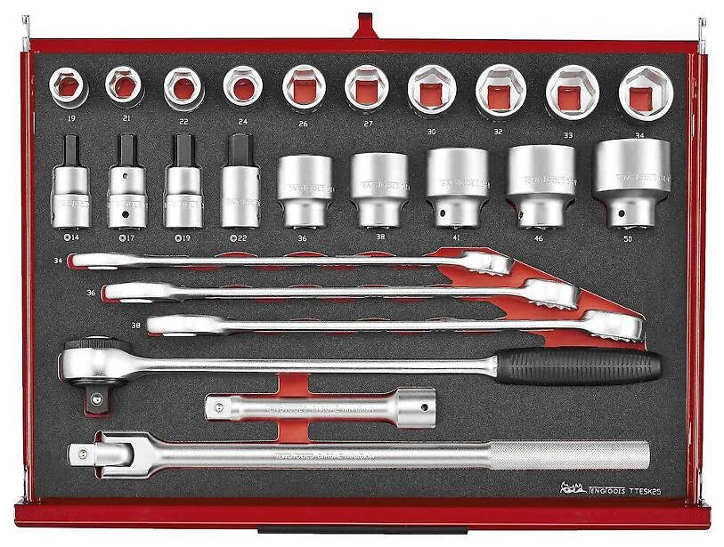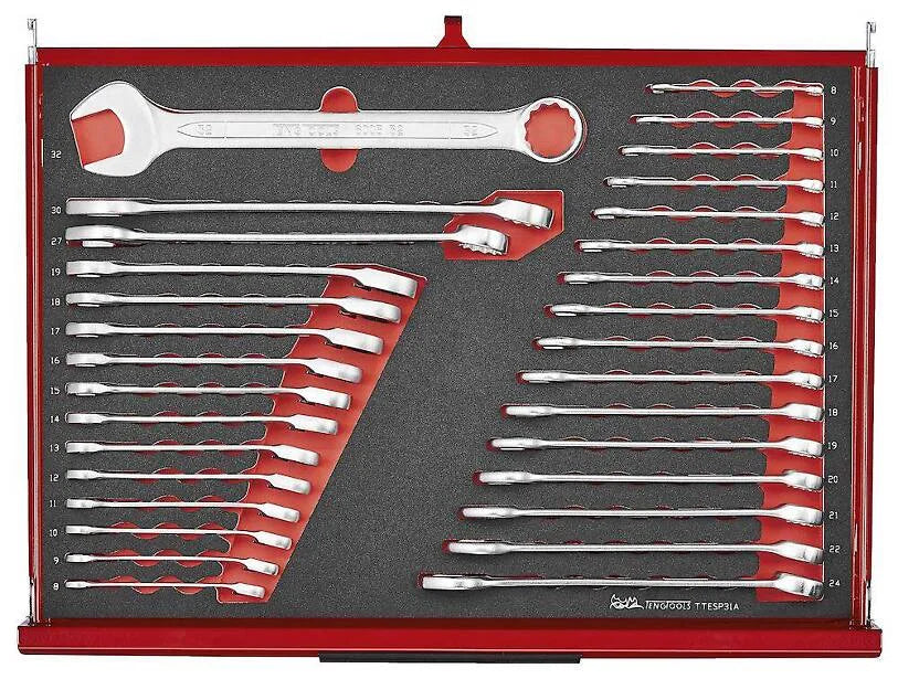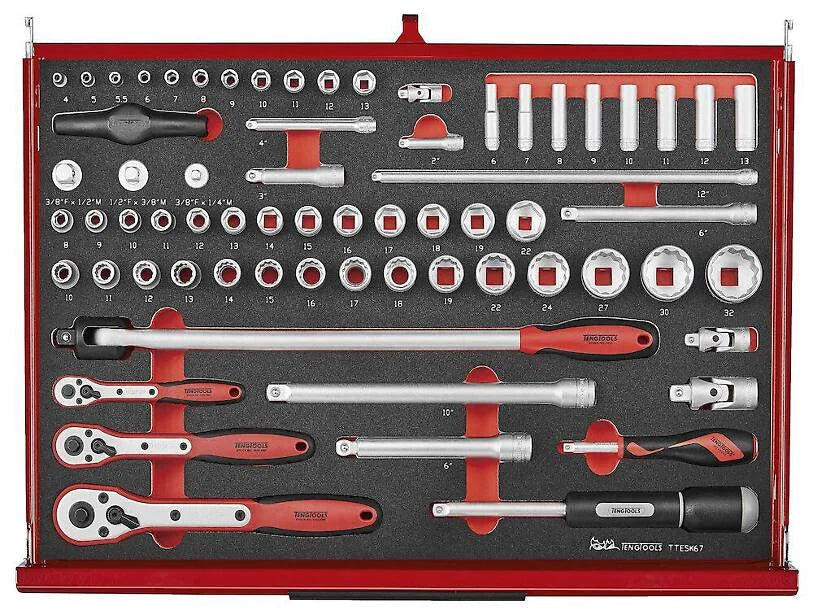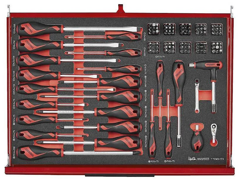 TengTools 26" PRO35™ stablet verktøysett TKS26R702F i matt rød er tilpasset fagfolk innen bil- og tungkjøretøyindustrien. Dette settet, bestående av 702 deler, er designet for å tilby en balansert kombinasjon av allsidighet og organisert lagring. Settet dekker et bredt spekter av verktøy nødvendig for arbeid med biler og tunge kjøretøy: 1/4", 3/8", 1/2", og 3/4" pipesett, bits, skralle, slagverktøy, kombinasjonsnøkler, skrutrekkere, bits, T-håndtak sekskant- og tx-nøkler, tenger, låsetenger, momentnøkler, gjengesett, bor, og generelle verktøy. De inkluderte settene er nøye organisert i presisjonskuttede høy tetthet EVA-skuffer i tre farger, som benytter 10 av de tilgjengelige 12 skuffene, og sikrer at hvert verktøy har sin dedikerte plass mens det også er plass til ytterligere verktøy. Verktøysettet er plassert i en to-lags verktøystabel bestående av et verktøyvogn og en verktøykasse. Denne konfigurasjonen gir en oppbevaringsløsning med totale dimensjoner på 680 mm i bredde, 460 mm i dybde, og 1443 mm i høyde (inkludert hjul). Oppbevaringsenhetene er laget av kraftig stål, har gjennomgått en 5-trinns fosfatfri rustbeskyttelsesprosess og er bygget for holdbarhet og langvarig ytelse i profesjonelle miljøer. Kabinettet har tilbehørshull på begge sider for ytterligere tilpasning og tilkobling av tilbehør. Mobiliteten forbedres av to 5" bremsede svingbare hjul og to 5" faste hjul, samt et komfortabelt gripehåndtak på siden av kabinettet for enkel manøvrering. verktøykassens karakteristiske foldbare front med TengTools-logoen sikrer ikke bare innholdet, men gir også et unikt preg til det totale designet. Et tresifret kombinasjonslås på hver enhet gjør det vanskeligere å få uautorisert tilgang til innholdet. verktøyvognen har syv skuffer: fem med en høyde på 75 mm og to høyere skuffer på 154 mm. Den tilhørende verktøykassen har fem skuffer – to med en høyde på 50 mm og tre med en høyde på 75 mm. Hver skuff er fullt uttrekkbar og har en lastekapasitet på 30 kg og er egnet for ulike verktøy og tilbehør. Hver skuff har lettgående kulelagrede skinner og er utstyrt med en lydabsorberende EVA-matte som også beskytter verktøyene.