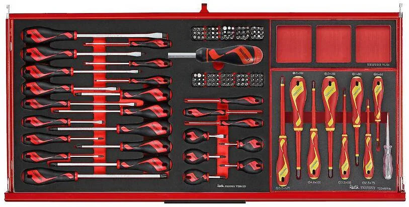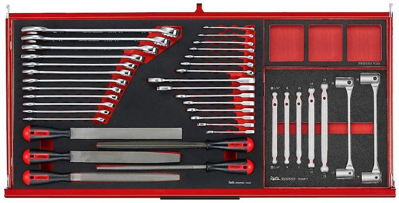 TengTools 37" PRO35™ verktøysett TKW37R637F er designet for mekanikere og inneholder en omfattende samling på 637 deler, plassert i en slitesterk TSW37R7 verktøyvogn i matt rød for profesjonelt mekanisk arbeid. Verktøyvognen måler 964 mm i bredde, 460 mm i dybde og 985 mm i høyde med hjulene montert. Dette kompakte designet kan romme et bredt spekter av verktøy samtidig som den opprettholder et håndterbart fotavtrykk på verkstedet. Vognen inkluderer syv fullt uttrekkbare skuffer: fem med en høyde på 75 mm og to større skuffer på 154 mm, som er egnet for større utstyr. 75 mm skuffene støtter opptil 25 kg hver, mens de høyere skuffene kan bære 40 kg hver. Hver skuff er utstyrt med lettgående kulelagrede skinner og en EVA-matte for å beskytte verktøyene og minimere støy. Dette settet dekker et bredt spekter av verktøy for mekanisk arbeid: 1/4", 3/8", og 1/2" drivre pipenøkler, bitsokler, skralle, filer, tenger, krafttenger, kombinasjonsnøkler, skrutrekkere, bits, T-håndtak seks- og TX-nøkler, momentnøkler, slagverktøy, og en rekke generelle verktøy. Alle verktøyene er arrangert i trelags presisjonsskårne høydensitets EVA-skummoduler som hjelper til med rask identifikasjon av manglende eller feilplasserte verktøy. Med sin 3-delte konstruksjon av kraftig stålramme er den pulverlakkerte verktøyvognen bygget for å tåle utfordringene i profesjonelle mekaniske miljøer. Den har gjennomgått en 5-trinns fosfatfri rustforebyggingsprosess for å gi motstand mot korrosjon. Slitesterke hjul på 2" bredde og 5" høyde, inkludert to bremsede svingbare hjul og to faste hjul, kompletteres med et komfortabelt grep på siden av vognen for enkel manøvrering. En ekstra funksjon er det tresifrede kombinasjonslåset som sikrer alle skuffene samtidig, noe som eliminerer problemet med å håndtere nøkler som lett kan gå tapt eller kopieres. Settet inkluderer seks TEZ01 høydensitets EVA-skummoduler (størrelse X2) med tre rom hver, perfekt for organisering av smådeler. En praktisk og slitesterk 18 mm laminert MDF-arbeidsflate (TC-TB03) følger også med.