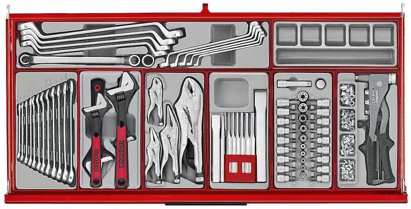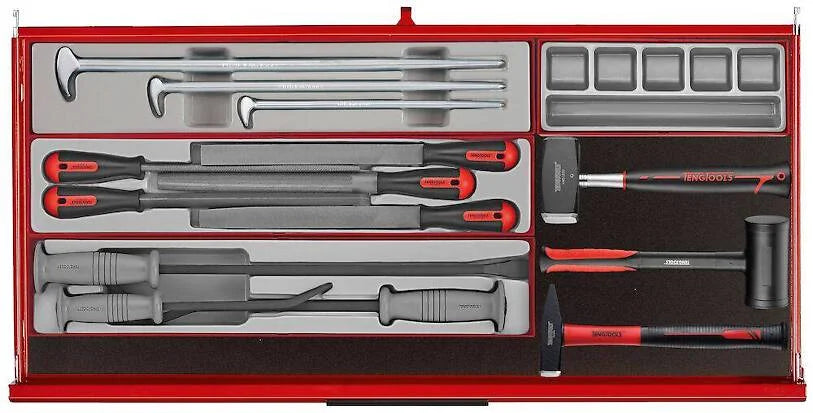 TengTools 37" PRO35™ verktøysett TKW37R595T i matt rød verktøyvogn er et 595-dels sett satt sammen for profesjonelle innen bil- og tungkjøretøysektoren, og muliggjør et omfattende utvalg av mekaniske operasjoner. Hvert verktøysett er metodisk plassert i en dedikert modul som er kompatibel med TengTools Tool Control System for enkel identifikasjon av manglende eller feilplasserte verktøy. Verktøyvognen måler 964 mm i bredde, 460 mm i dybde og 985 mm i høyde med hjulene montert. Dette kompakte designet gir generøs lagring som passer til profesjonelle miljøer. Den har et slitesterkt 3-delt kraftig stålchassis og har gjennomgått en 5-trinns fosfatfri rustforebyggingsprosess for å sikre korrosjonsbestandighet. Den har syv fullt uttrekkbare skuffer – fem med en høyde på 75 mm og to høyere skuffer på 154 mm. Hver skuff støtter opptil 25 kg mens de større skuffene kan bære opptil 40 kg. Alle skuffene er utstyrt med kulelagrede skinner samt støyreduserende og beskyttende EVA-matter. Et tresifret kombinasjonslås sikrer alle skuffene samtidig, og fjerner bryet med å administrere nøkler som lett kan gå tapt eller kopieres. Verktøyene er valgt for bilarbeid: 1/4", 3/8", 1/2", og 3/4" drivre pipenøkler, bitsokler, skralle, slagverktøy, kombinasjonsnøkler, skrutrekkere, bits, T-håndtak seks- og TX-nøkler, tenger, krafttenger, momentnøkler, gjengestag, avtrekkere, brekkjern, filer, hammere og generelle verktøy. Den har 2" brede kraftige hjul, inkludert to 5" bremsede svingbare hjul og to 5" faste hjul, samt et komfortabelt håndtak på siden som hjelper til med manøvreringen. Den inkluderer en 18 mm laminert MDF-arbeidsflate, en hylle som passer nederst på siden av verktøyvognen for oppbevaring av lengre gjenstander, og seks TTZ01-moduler med tre rom hver for oppbevaring av smådeler og tilbehør.