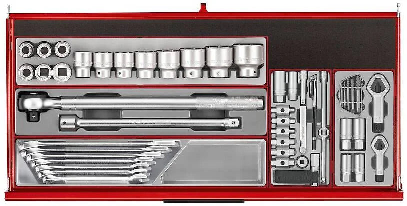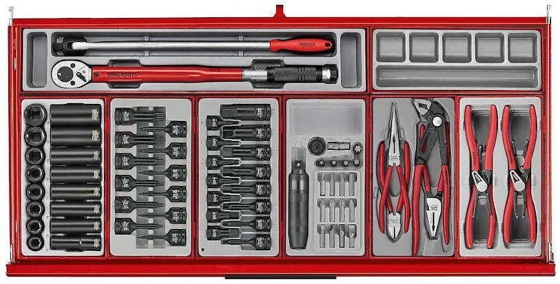 - Verktøyene leveres i en matt rød verktøyvogn med syv fullt uttrekkbare skuffer, alle med kulelagrede skinner